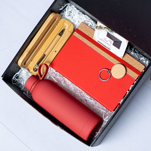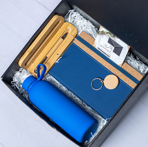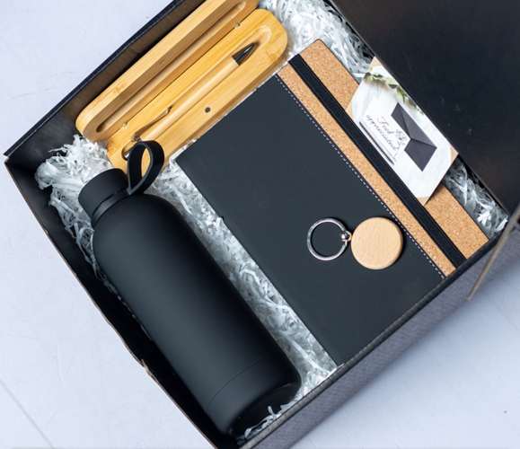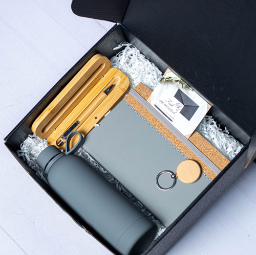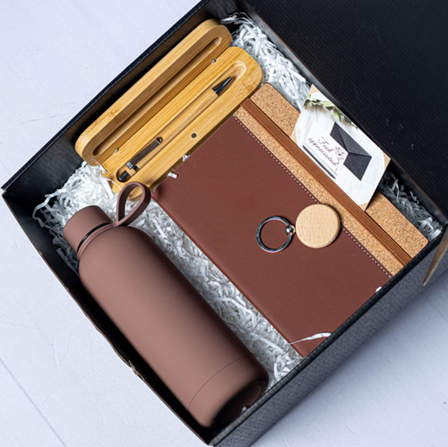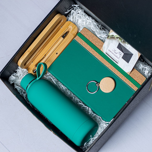 Eco-friendly bamboo gift set featuring a wooden side slim bottle, matching pen, and key holder. Perfect for corporate gifting, events, and special occasions.