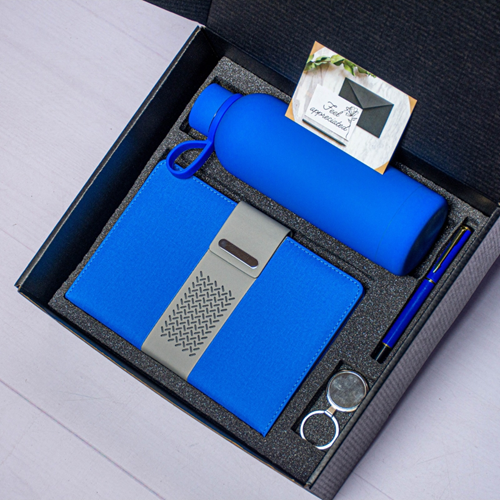 Elegant corporate gift set featuring a sleek water bottle with buckle and pencil-style top. Perfect for employee rewards, client gifts, and business events.