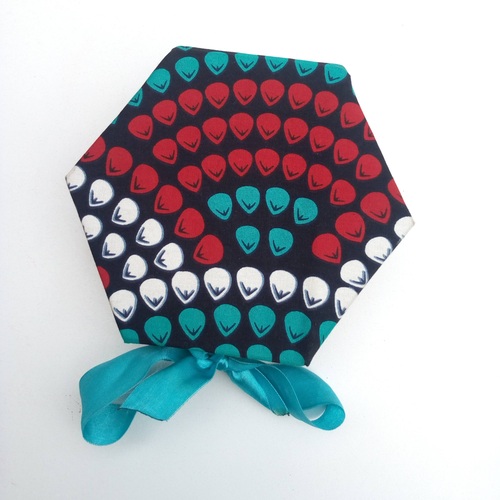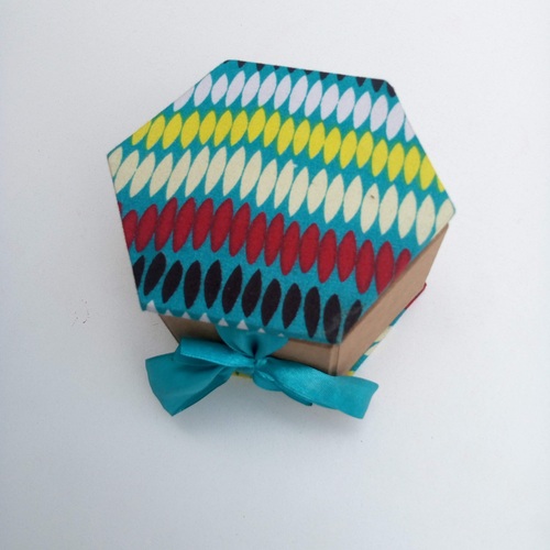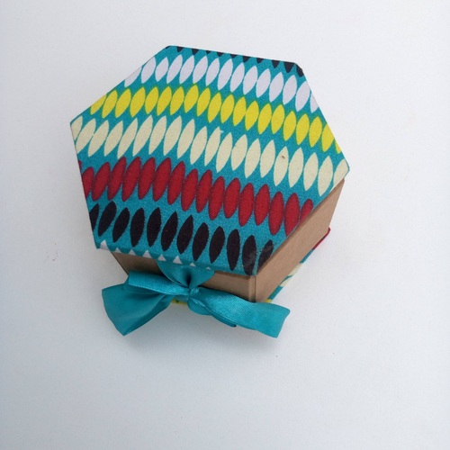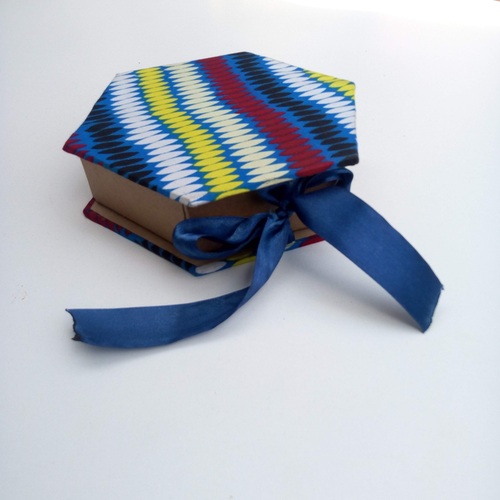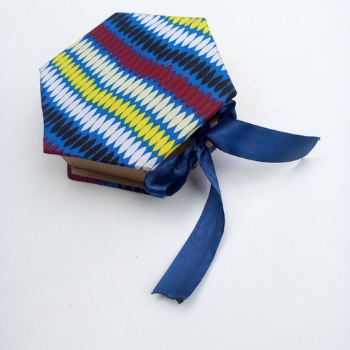Featuring a striking hexagonal shape, vibrant Ankara fabric, and a decorative ribbon, this unique gift box is perfect for impressing clients, employees, or event attendees with thoughtful, high-quality packaging.